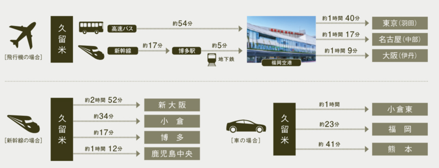 久留米市は人口や都市規模において、福岡市、北九州市に次ぐ福岡県第3の都市です。福岡都市圏へのアクセスがよく、福岡屈指の都心「天神」エリアには「西鉄久留米」駅から約32分(特急利用)。交通の主要拠点であるJR「博多」駅にはJR「久留米」駅(車7分、約2560m)から約17分(新幹線利用)。西鉄「久留米」駅から高速バスを利用すれば、「福岡空港国内線北」停まで約53分(通勤時)という高い交通利便性を誇ります。