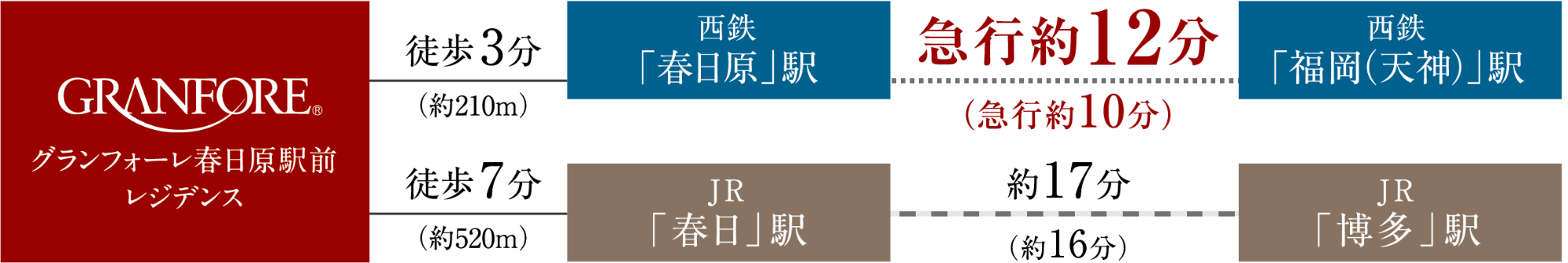 ※1 西鉄『春日原』駅〜『福岡(天神)』駅 ※2 JR『春日』駅〜『博多』駅