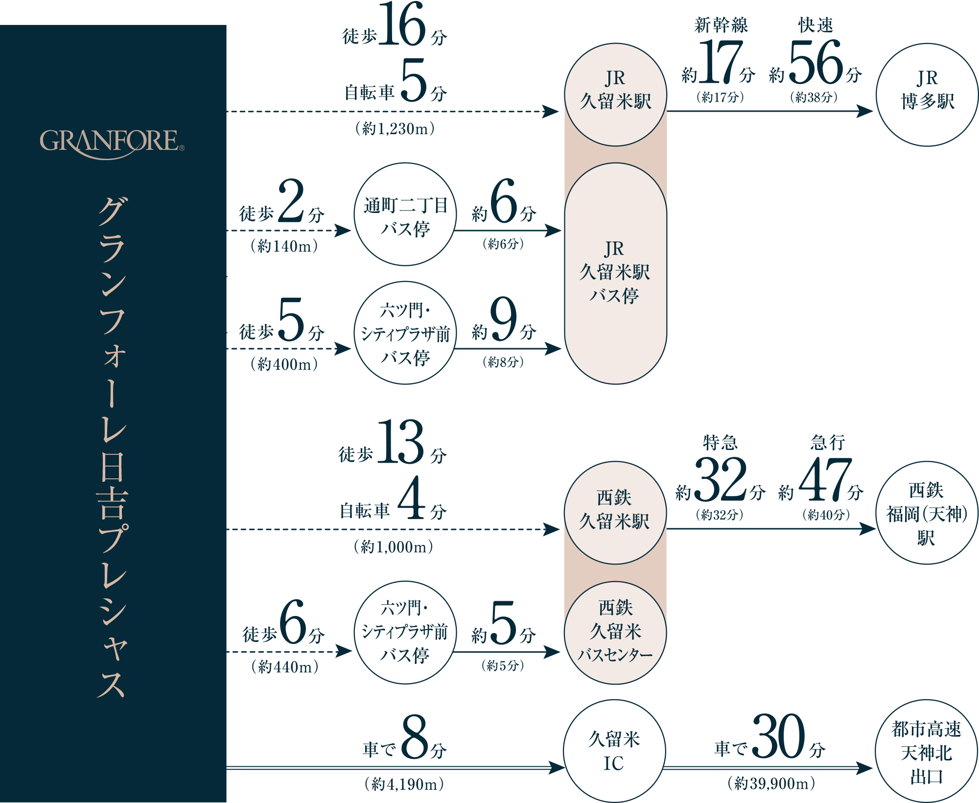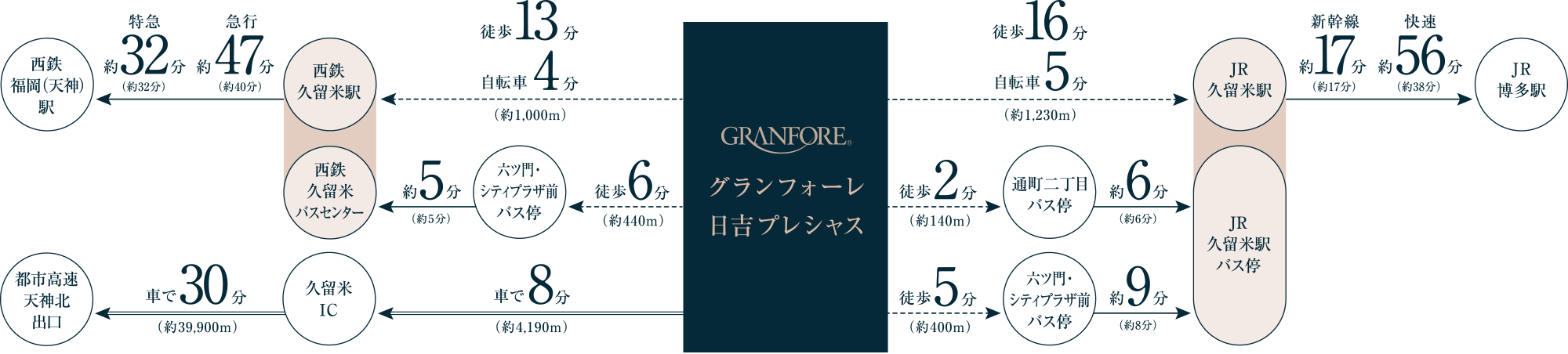 「西鉄久留米」駅とJR「久留米」駅を利用し、